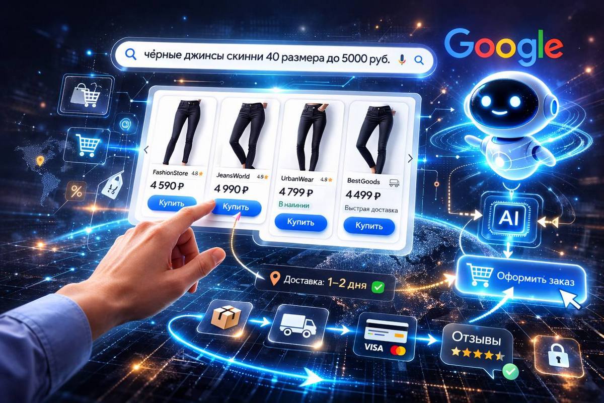 Пользователь пишет промпт вроде: «Нужны джинсы skinny черные, размер 40, до 5000 рублей с доставкой по Москве». Далее ИИ подберет варианты и поможет завершить заказ прямо внутри экосистемы Google.